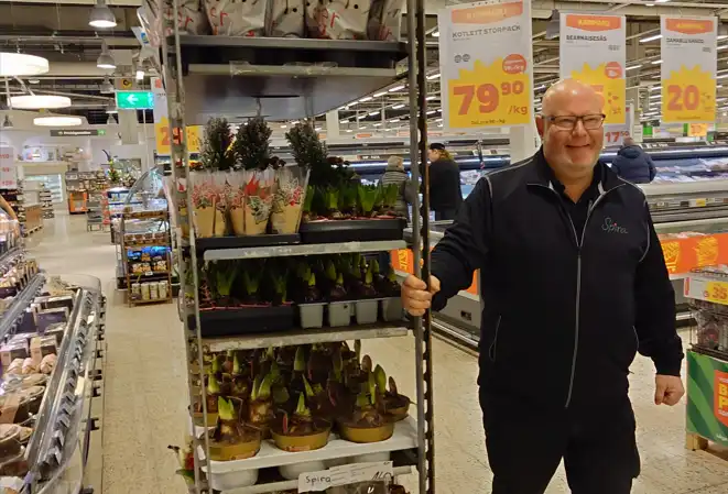 Thore skyndar in på lagret för att hämta nyligen anlända vagnar med fräscha blommor. Han har jobbat på Spira Blommor i 17 år och vet precis vad som krävs för att skapa en välkomnande och säljande blomsteravdelning.